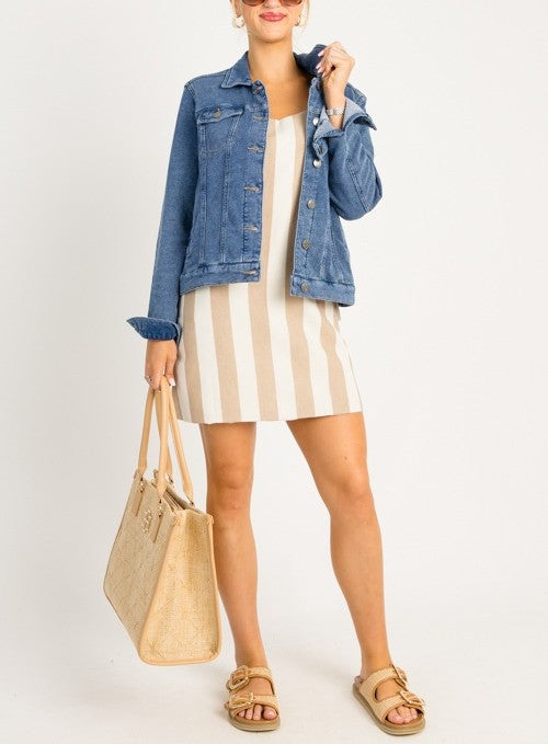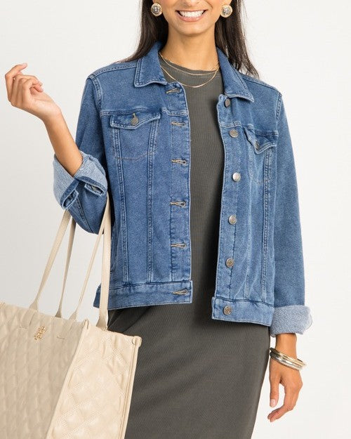 This incredible jacket gives you the timeless look of true denim, but with a secret twist – it's actually crafted from a super soft and comfortable knit fabric that feels like your favorite sweatshirt. That means ultimate stretch and zero stiffness, allowing for easy, all-day wear. It still has all the essential details you love: a classic collar, functional button front, convenient buttoned chest pockets, and handy side pockets. This jacket is truly the best of both worlds, blending classic style with unparalleled comfort!
