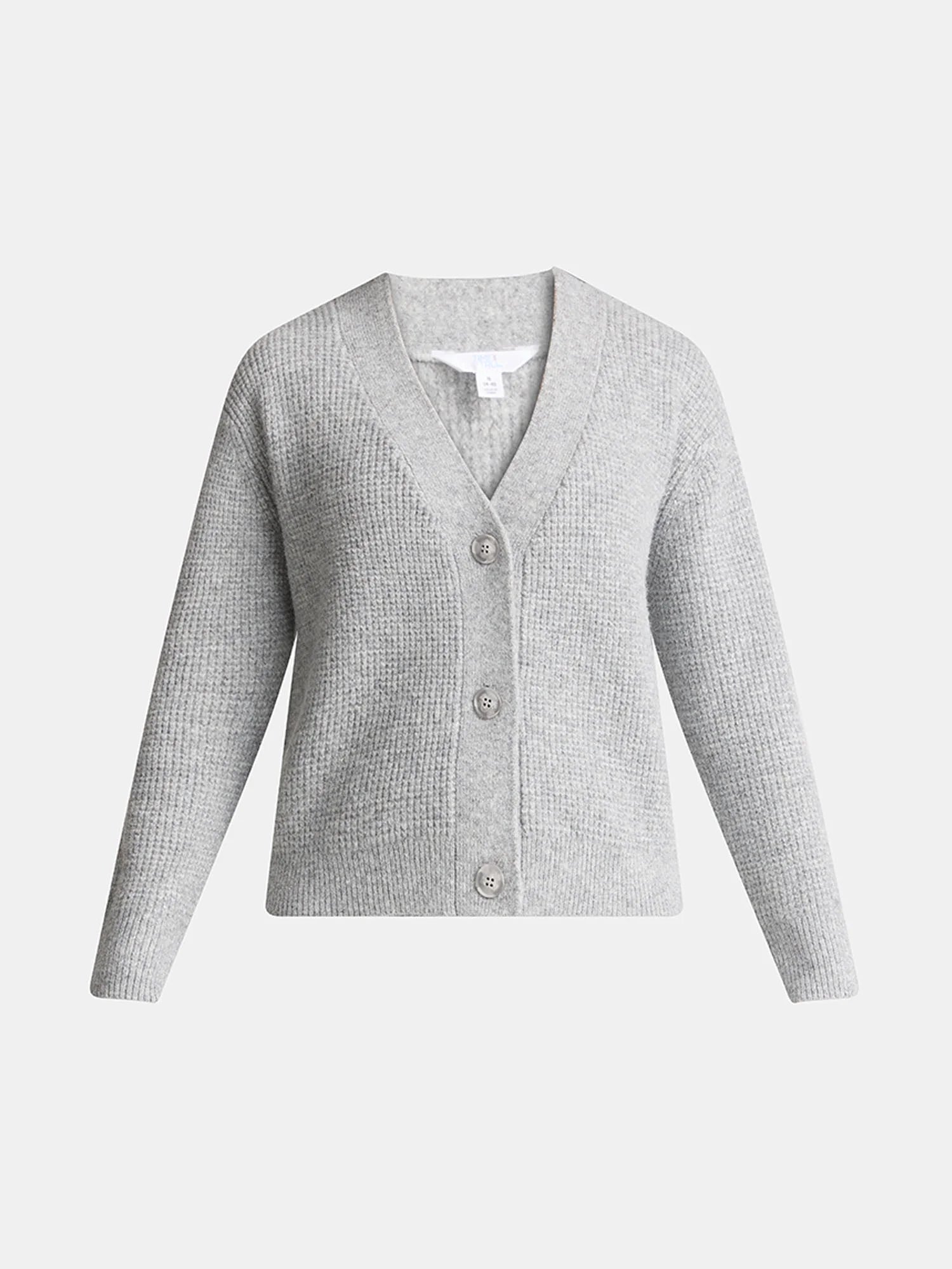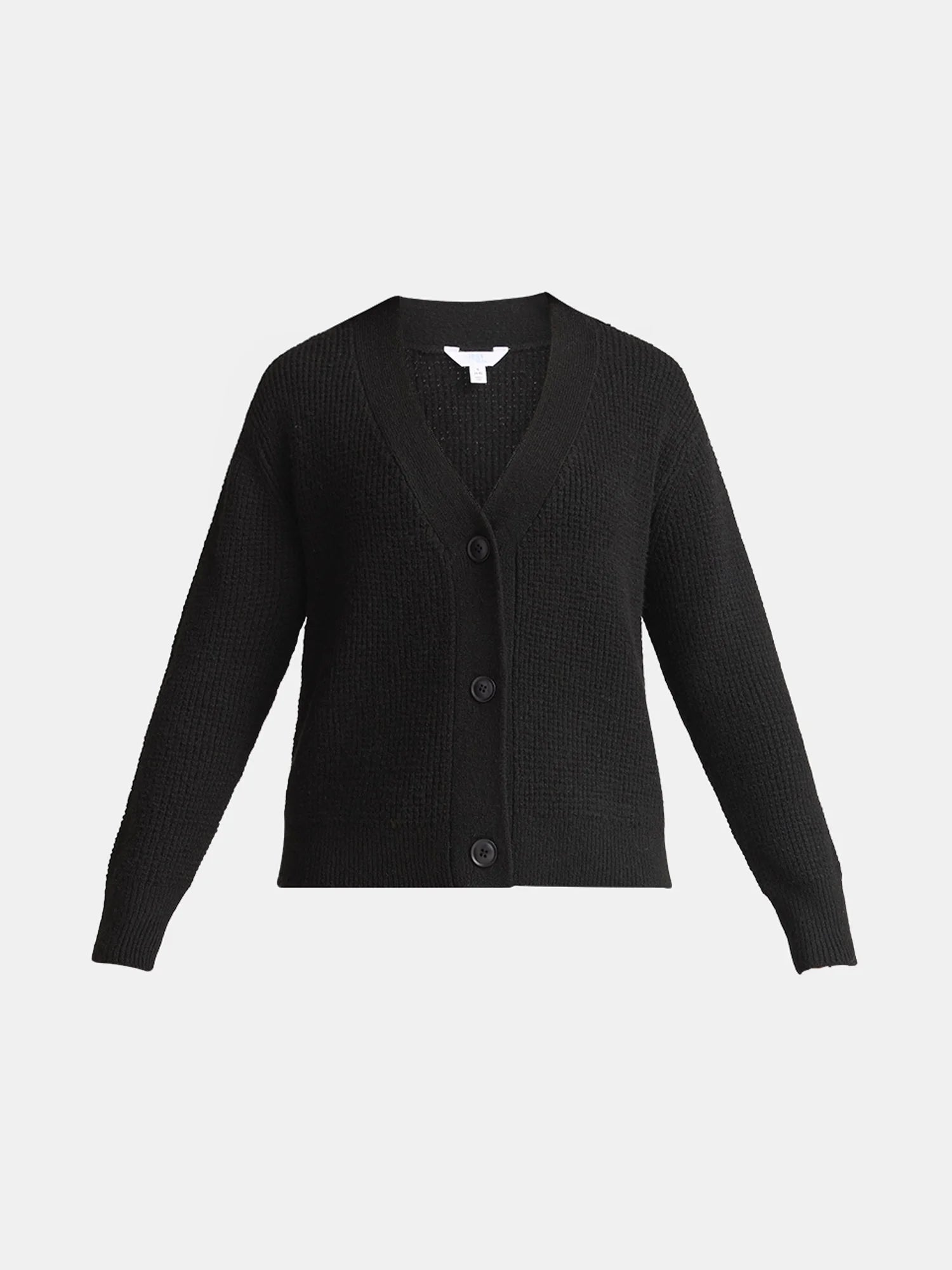 Sweater features: Relaxed fit; V-neckline; button front; drop-shoulder long sleeves with ribbed cuffs; no pockets; ribbed hem; textured; soft feel